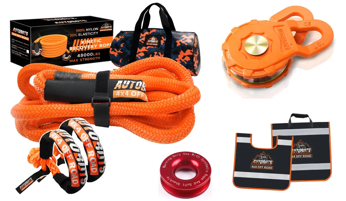 - Recovery Strap. A quality recovery strap is your first line of defense. Not a tow strap, those don’t stretch. You need a kinetic recovery strap rated for at least 30,000 pounds. The stretch absorbs shock and multiplies pulling force. Cheap straps snap under load, and a snapping strap becomes a missile that can kill someone. Spend money on a really high-quality strap.